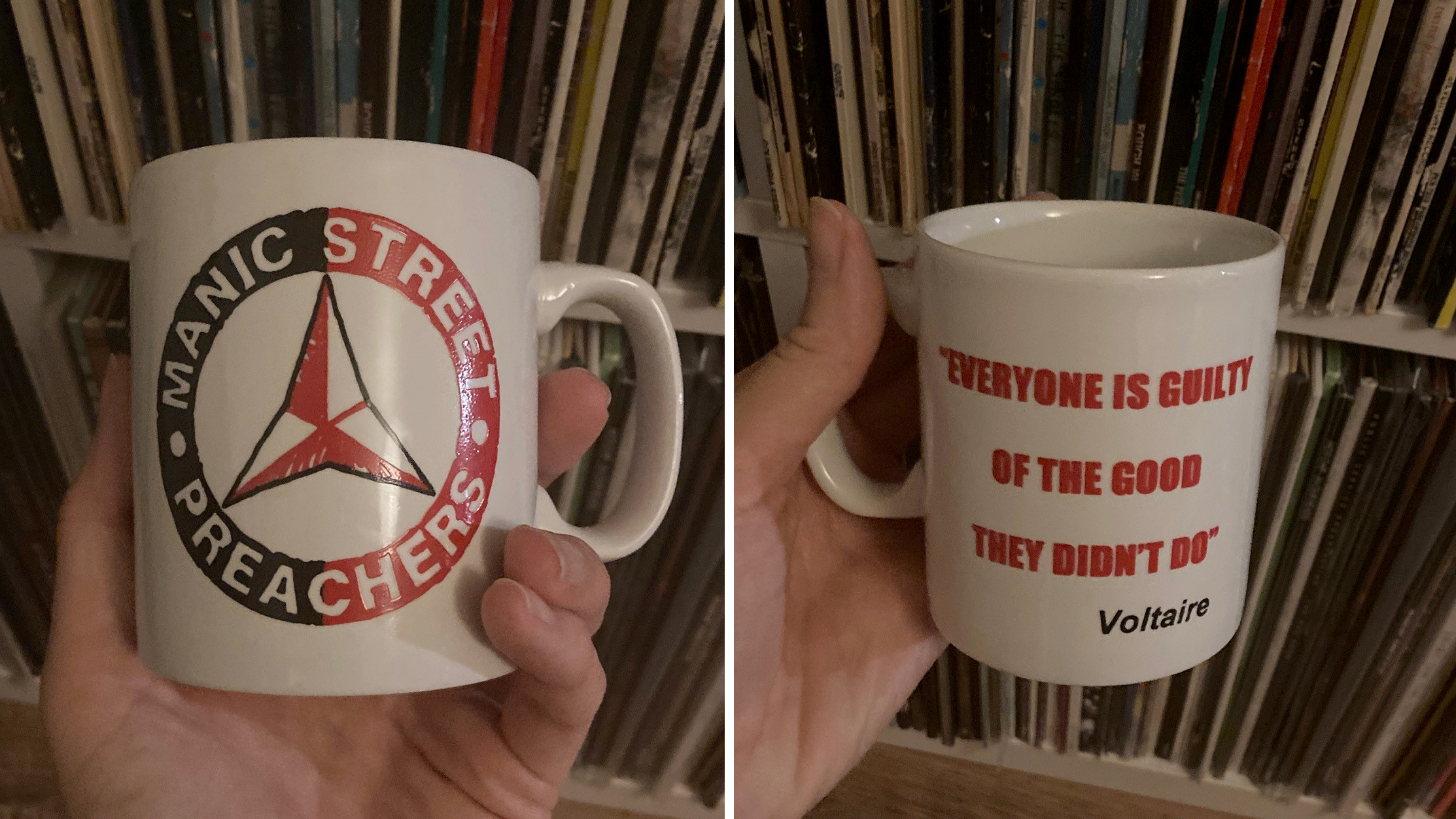 This drinking vessel has hosted many gallons of tea. It has survived three student flats and at least eight house moves, outliving its crockery siblings by decades. I often think of its message when I do something selfish; when I rush past someone asking for spare change or when I’m wasteful in some way. I bought this Manic Street Preachers mug when I was 16 from the merch stall at Doncaster Dome.