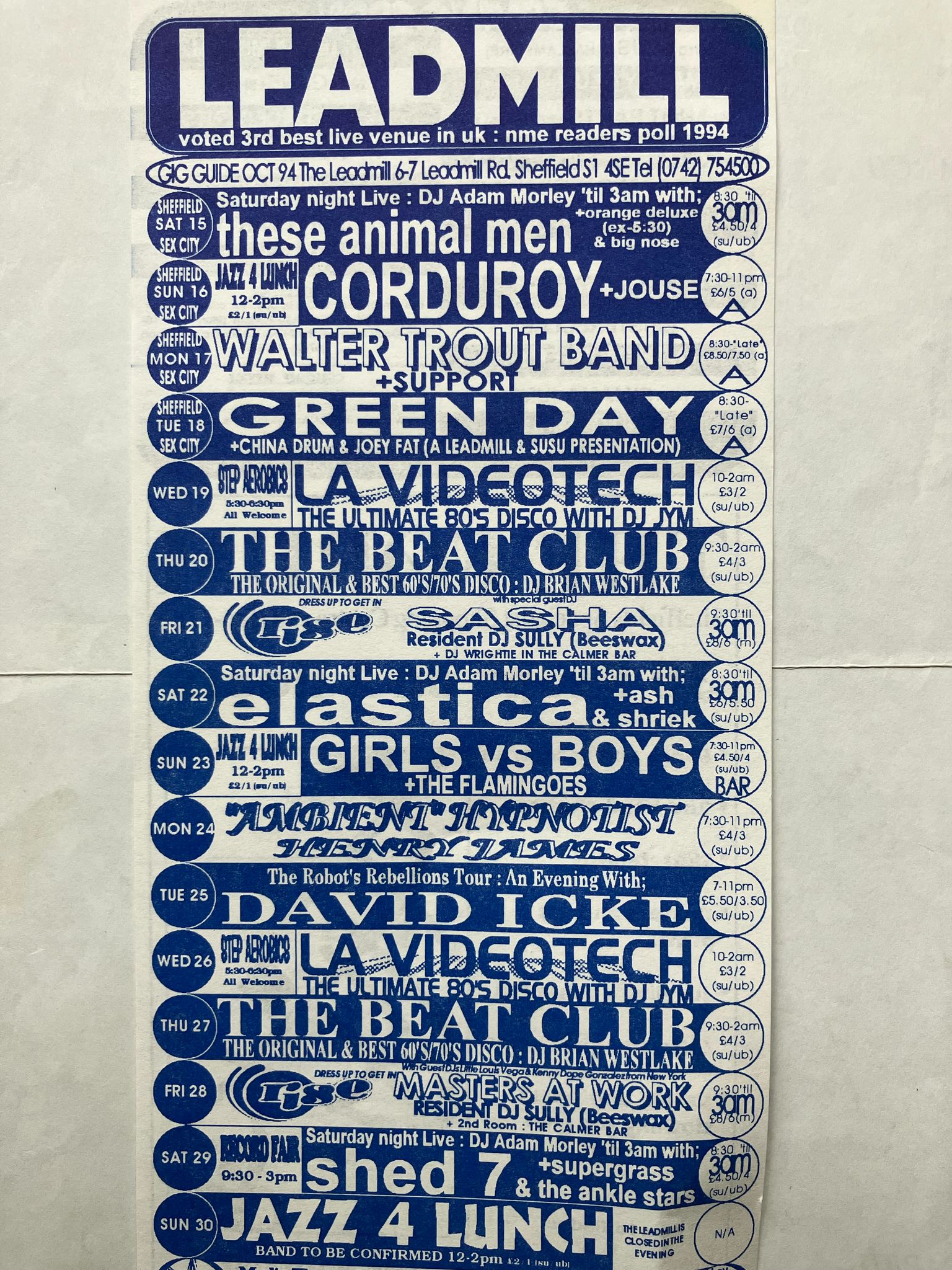 JC: I found a flyer from Sheffield Leadmill (‘Voted third best live venue in UK!’), October ’94, and in one month they put on These Animal Men, Elastica, Ash, Shed 7, Supergrass, Green Day, and Flamingoes. Apart from Green Day, obviously, all these new bands were on the starting blocks, waiting to take off. It was unbelievably exciting. After a 10-year apprenticeship, it finally felt as if we were “going in”; that it was almost pre-ordained. We had daytime Radio One airplay and were “hotly tipped for the top” in both Melody Maker and NME. Of course, we didn’t know that the gatekeepers of the press would finally decide who was chosen or not. We were about to find out…